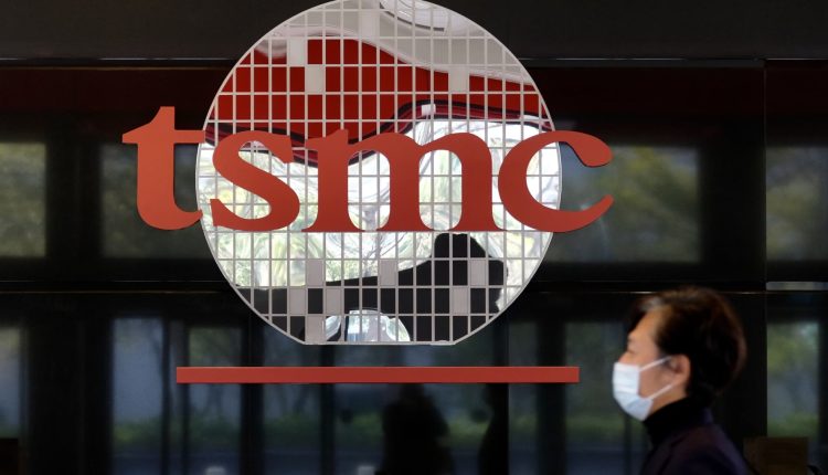 A man walks past TSMC’s logo at the company’s headquarters in Hsinchu, Taiwan.