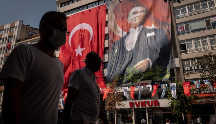 A Turkish national flag, left, and a flag bearing the portrait of Kemal Ataturk, founder of the modern Turkish republic, hang from the exterior of a building in the Sisli district of Istanbul, Turkey, on Monday, Aug. 29, 2022.