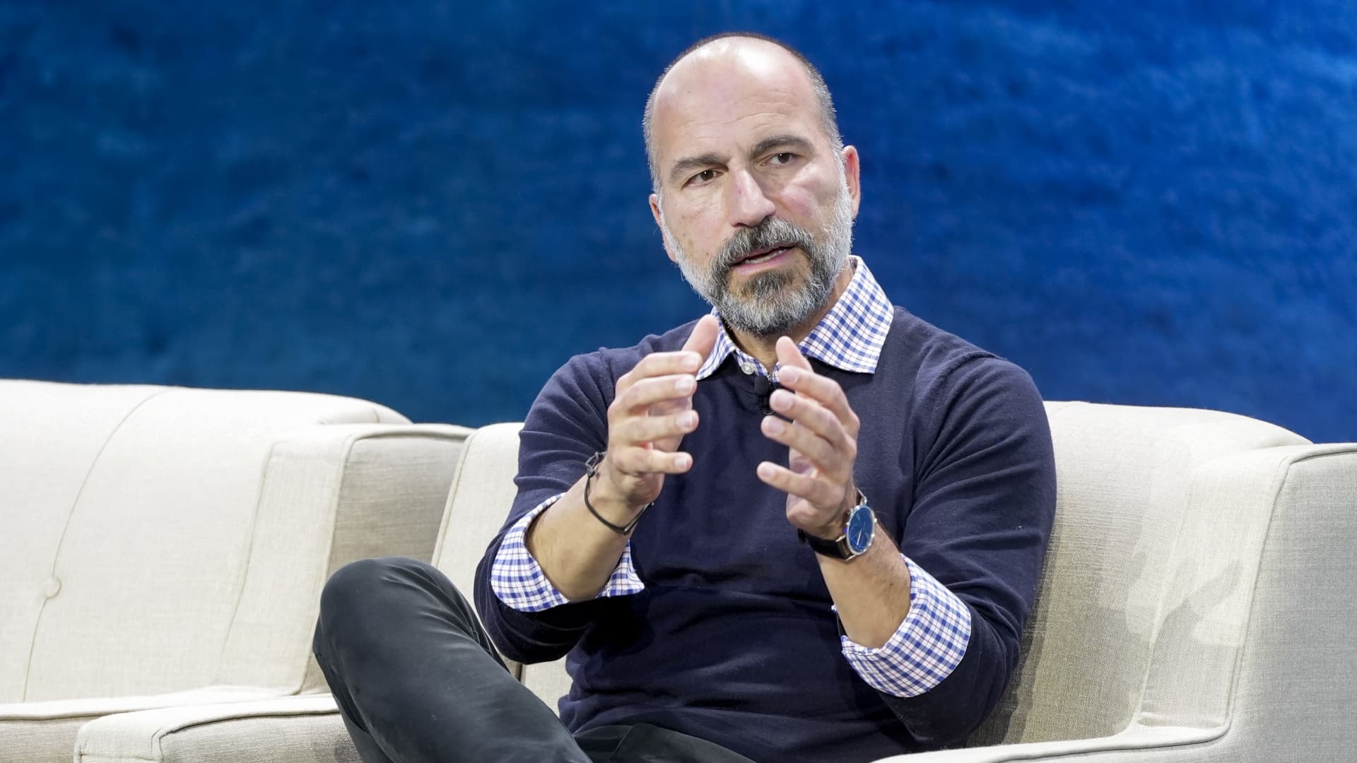 CEO of Uber, Dara Khosrowshahi, speaks onstage during GE The Lean Mindset: The Pursuit Of Progress Event at Chelsea Industrial on September 06, 2023 in New York City.