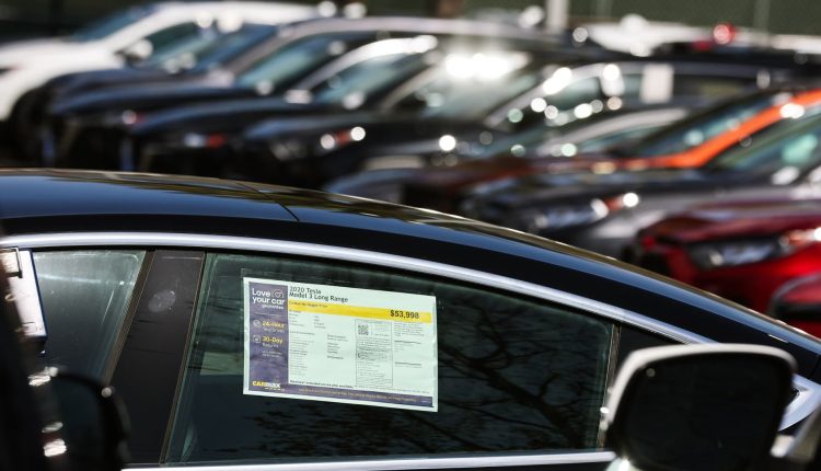 A used 2020 Tesla Model 3 is available for sale on a CarMax lot on March 10, 2022 in Burbank, California.