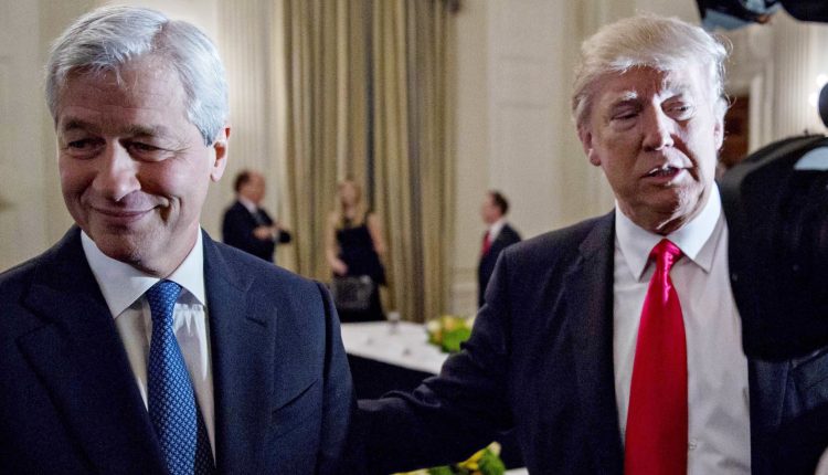 In this 2017 file photo, President Donald Trump stands next to Jamie Dimon, chief executive officer of JPMorgan Chase & Co., left, in the State Dining Room of the White House in Washington.