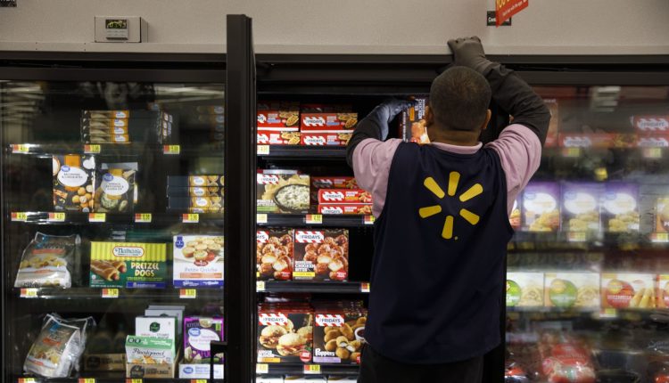 An employee restocks frozen food products at a Walmart Inc. store in Burbank, California.