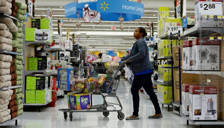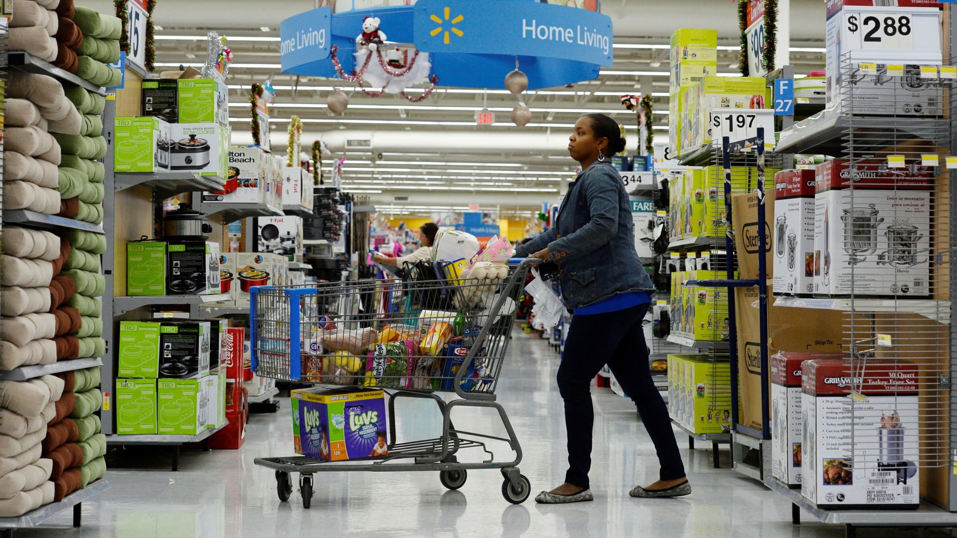 A customer pushes her shopping cart through the aisles at a Walmart store in the Porter Ranch section of Los Angeles.