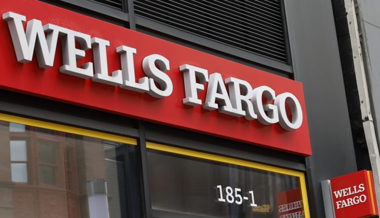 Wells Fargo bank signage is seen on Broadway on April 12, 2024 in New York City.