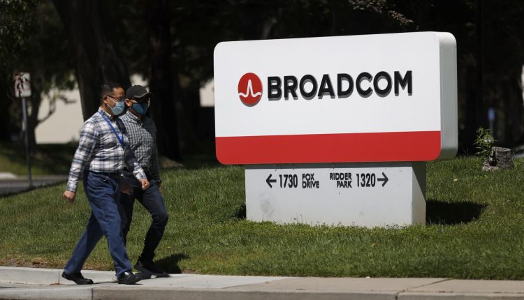 A sign is posted in front of a Broadcom office in San Jose, California.