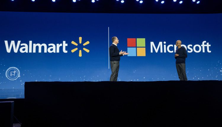 Doug McMillon, chief executive officer of Walmart Inc., left, and Satya Nadella, chief executive officer of Microsoft Corp., during the 2024 CES event in Las Vegas, Nevada, US, on Tuesday, Jan. 9, 2024.