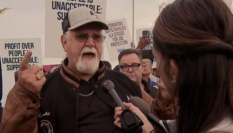 “Who’s the greedy ones here? These companies over in Europe, they don’t give a f*** about us,” he told members on the picket line after the start of the strike early Tuesday, referring to foreign-owned shipping lines on the opposing side.