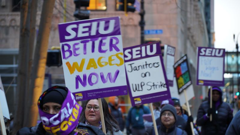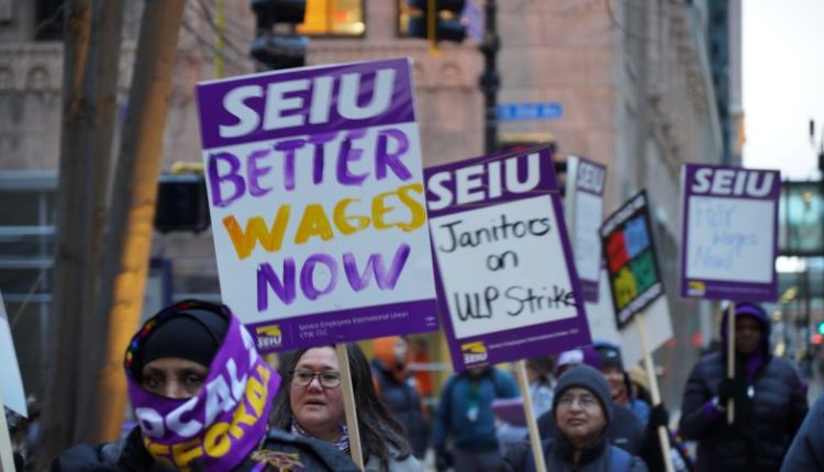 One of those on the picket lines Monday was George Mullins, 66, who has worked as a janitor cleaning office buildings for 35 years. He works at the corporate offices of Target, employed by a private cleaning contractor. He said his pay of $18.62 an hour is barely enough to get by on.