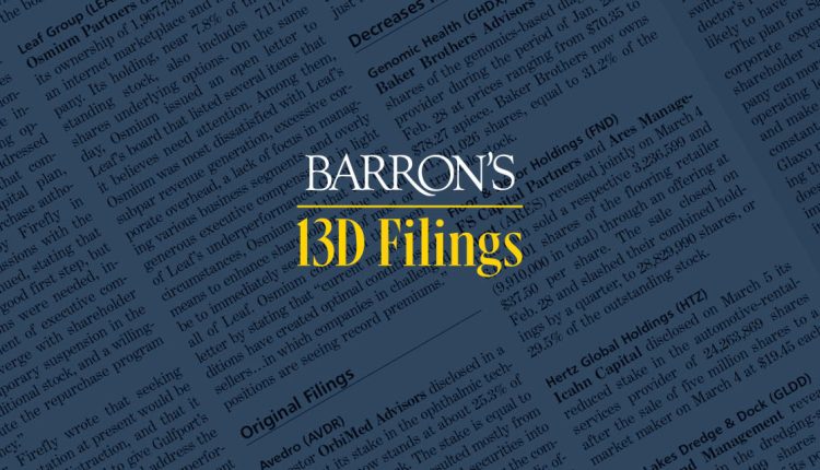 These disclosures are from 13Ds filed with the Securities and Exchange Commission. 13Ds are filed within 10 days of an entity’s attaining more than 5% in any class of a company’s securities. Subsequent changes in holdings or intentions must be reported in amended filings. This material is from Oct. 19 through Oct. 25, 2023. Source: VerityData
