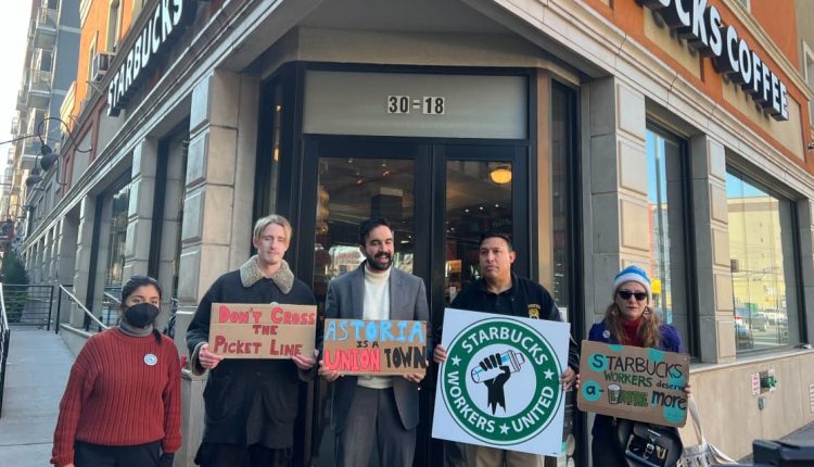 On Thursday, a group of unionized employees picketed outside the Starbucks where they work in Queens, New York. They held up handmade signs, drank coffee from competitor Dunkin’, and asked customers to avoid going in the store.