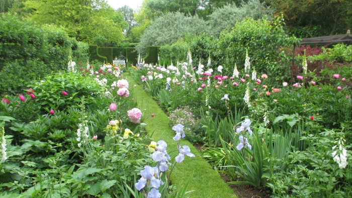 In box-edged beds overlooked from the house, Elizabeth bedded out 2,500 red and yellow fibrous begonias each year. They too are not simply French: English parks and roundabouts used them often. They have now been replaced with mixed plantings, leading up to an excellent line of Benton End irises, bred by the artist Cedric Morris.