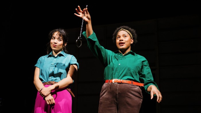 Barrett and Stevens go at all this with a buzzing mix of music, mischief and mayhem, blending satirical agitprop and camp spectacle. The show is underpinned by the 1980s-influenced score composed by Frew, played live, by Frew and Calie Hough, on synth and drums. The multitasking four-strong cast (Stevens, Ericka Posadas, Nkara Stephenson and Zachary Willis) clamber round the set, using school hall furniture — benches, blackboards and gym stools — as props, turn some of the most obnoxious headlines into mocking chants and re-enact famous protest acts, culminating, spectacularly, in the moment when lesbian activists abseiled on to the floor of the House of Lords.