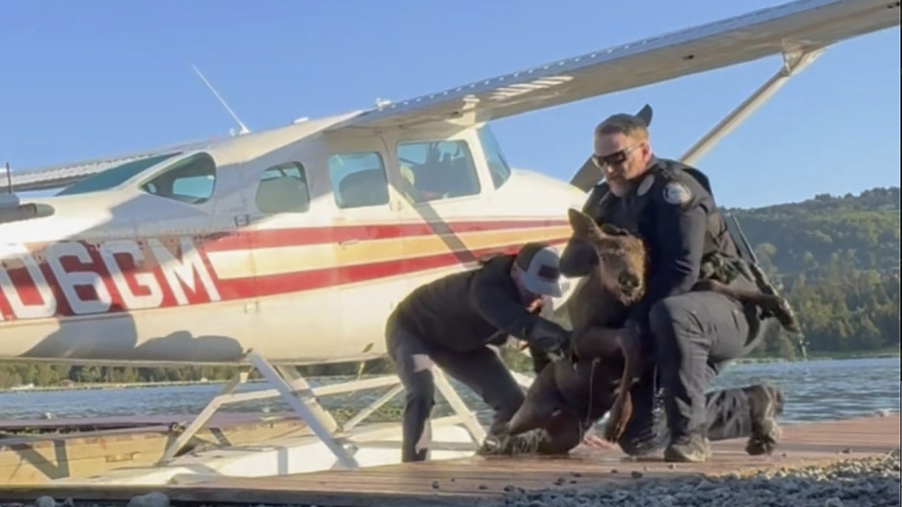 The young moose kept attempting to get out of the lake, but its hooves couldn’t catch a grip on top of the metal floats, which replace the wheels on a plane and allow it to take off and land on water.