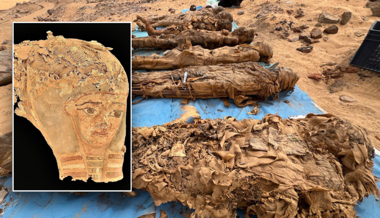 Excavations began at the site in 2019, but some of tombs were unknown to archaeologists until now. Pictures show a line of remarkably preserved mummies outside the tomb, and interior pictures show mudbrick walls and an interior court.