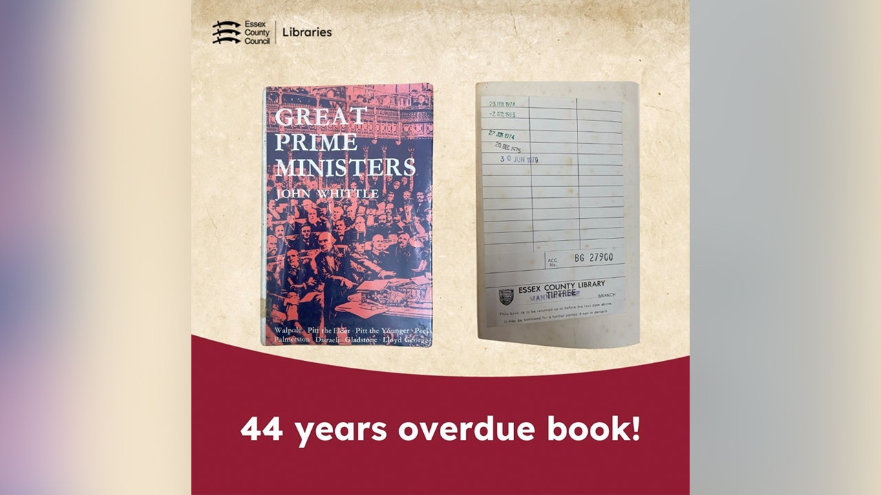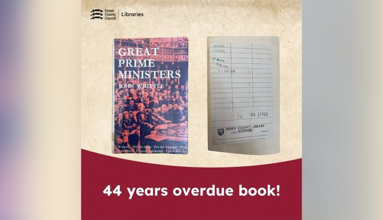 The book, “Great Prime Ministers” by John Whittle, was originally due back at the Essex County library’s Tiptree location on June 30, 1979.