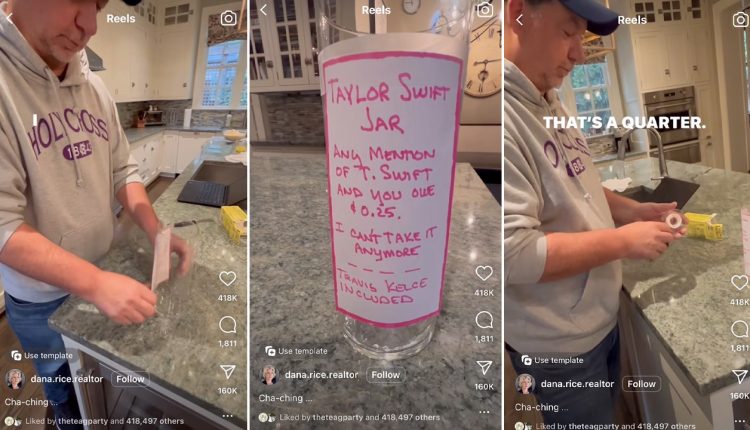 Dana Rice, a realtor in the Bethseda, Maryland and Washington, D.C. area, has gone viral, garnering over 9.8 million views on Instagram, after capturing the comical moment her husband created a “Taylor Swift jar.”