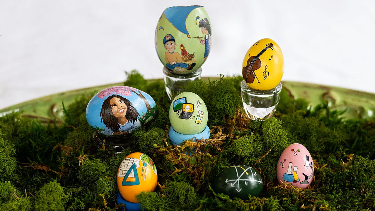 This year’s collection includes two regular-sized eggs with imagery of young children, plus five smaller, pullet eggs with images of “STEAM” professions painted on them. (STEAM stands for science, technology, engineering, arts and mathematics.)