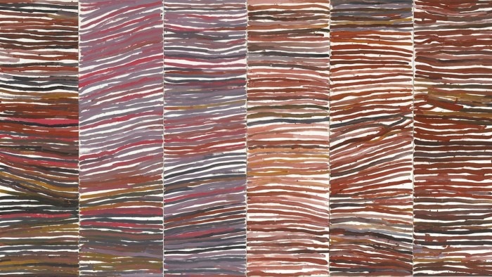 One of the defining features of Kngwarray’s approach to artmaking was her restlessness. As she entered her eighties, her style radically changed: dots gave way to sweeping gestural marks, and her subtle monochromes were replaced with a bold palette. In 1994, she painted the six panel “Untitled (awely)”, which was originally shown in the Australian Pavilion at the 1997 Venice Biennale. At around two metres high and three and a half metres wide, its rhythmic repetition of undulating ochre, brown, purple and black stripes invokes the painted skin of the Anmatyerr women dancing their ceremonies beneath an immense sky.