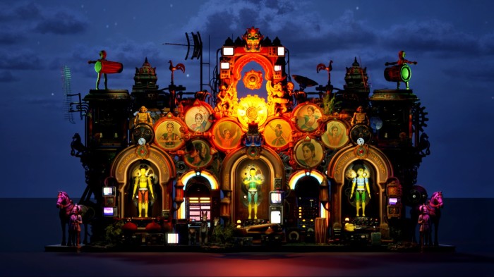 Some of the most memorable works here invite visitors to join in the music-making themselves. The interactive wall installation “Resonance Continuum”, by the collective Elsewhere in India, is a giddy lark that invites visitors to perform different poses from classical Indian dance to trigger musical instruments in an evolving soundtrack. Further on, the exhibition’s standout is “UN/BOUND” by Trans Voices, Ilā and Monom, which takes the form of an ethereal choral suite playing loudly in a dark room. Visitors can contribute using microphones that smartly tune your voice so that your warblings become an organic part of the wider soundtrack. As well as the undeniable pleasure of making music with others, there is something powerful about letting your voice melt into a greater harmony.