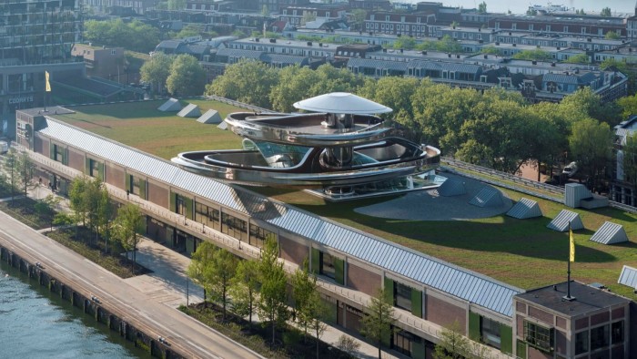 For Rotterdam he has created a tangle, an intertwined pair of spirals that wind up through the building, kissing occasionally and exploding out beyond its roof. It might be a staircase, the main route up through the building, but this is not really about function. The gleaming stair, which the museum refers to as the “Tornado”, twists its way up to become a logo, a landmark on a dockside increasingly dominated by towers. It looks like a shredded Anish Kapoor sculpture. “Migration is all about movement,” Ma tells me, standing in the sunshine on the roof, “and I wanted to express movement at the heart of this building, an experience for visitors.”