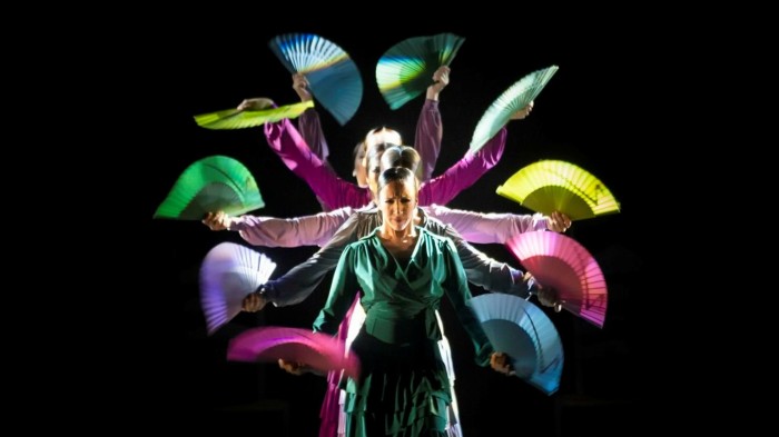 Vuela (“Fly”) is a long show — two hours, no interval — in which the virtuoso numbers are supplemented by five musicians, two singers, a male soloist (Daniel Saltares) and a chorus line of six smiling señoritas. Like our first glimpse of Baras back in 1999, the slick production often felt stagy and over-rehearsed but the 54-year-old star loosened up for the enjoyable final section and her own magnificent skills saved the evening from becoming an outsized floorshow.