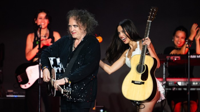 The pair duetted on two Cure tracks, “Friday I’m in Love” and “Just Like Heaven”. Rodrigo beamed at her 66-year-old guest, her smile framed by immaculate red lipstick. He looked bashfully back at her, his own mouth smeared by messy red lipstick, his signature look. At least one middle-aged onlooker in the audience felt himself well up at this unexpected mirror image of Glastonbury festivals from past and present.