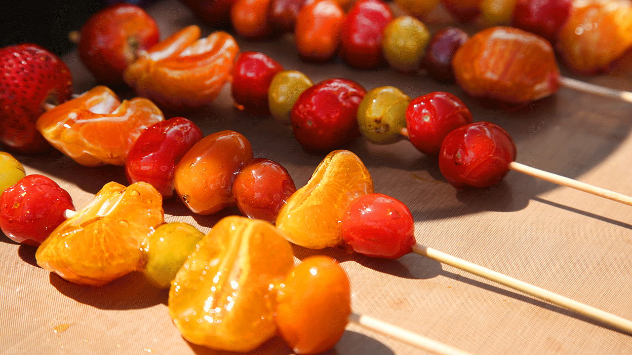 “It’s made by coating skewered fruits like hawthorns or strawberries in a layer of maltose caramel,” she also said.