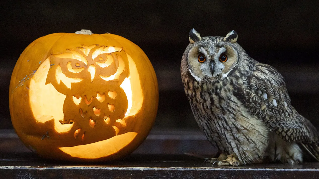 In time for Halloween, owl sits on pumpkin carved with its likeness ahead of the spooky holiday