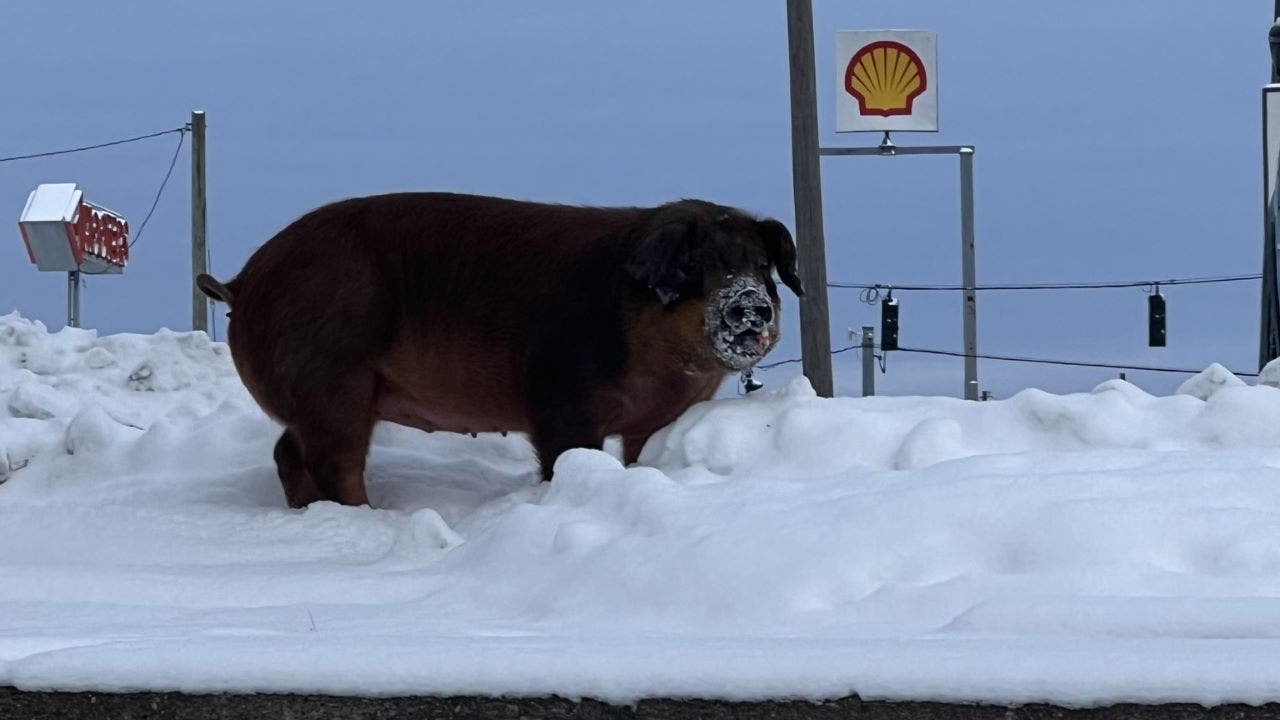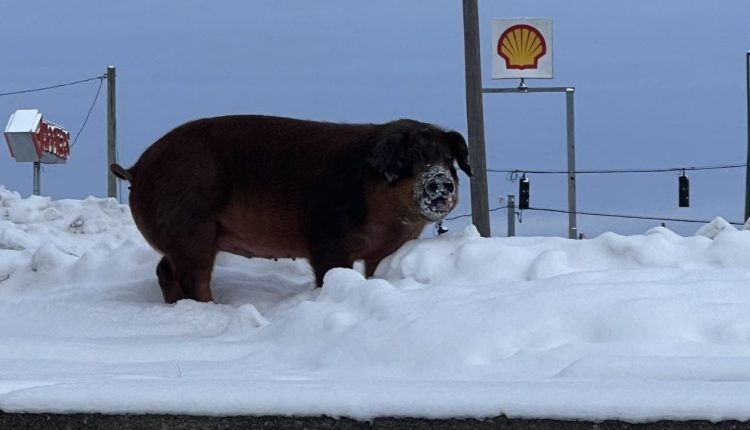 “Officers responded this morning to a pig on the loose!” the police department wrote. “After escaping its trailer, this hefty friend spent some time enjoying the winter weather and recent snowfall.”