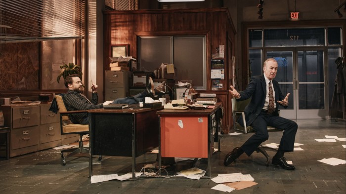 Here and in act two — set in their soulless office, post-break-in and mid-investigation by a detective — the production’s strong suit lies in its two melodic lines. One is Mamet’s verbal knife-fights, still a star attraction: the way Levene, Roma and Moss circle and wear down one another in profane bids to hold the floor and assert dominance, every exchange a battle mirroring the war on the monthly sales board. But part of Marber’s direction is also to find ways of switching up rhythms, and that’s where a sense of melancholy comes in, like Odenkirk getting a swing in his step with a sale, only to deflate again when his redemption evaporates, or McKean’s “so this is still my life” haplessness, clinging to him like stale cigarette smoke.