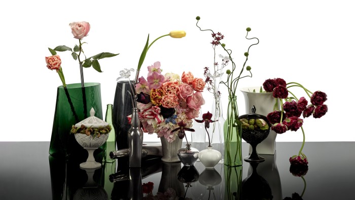 Van Assche’s next project, made in collaboration with Belgian design brand Serax, sees him come full circle: a range of vases and bonbonnières – those decorative boxes originally designed to hold sweets. The Josephine collection, named after the designer’s grandmother, ranges from classical urn shapes to beer bottle silhouettes in porcelain, glass, marble or concrete (from €49 to €330); each vase comes with a glass tube, encased in silver, which can hold a single flower. There are also single hand-blown glass flowers (from €42) to be mixed in with your real flowers if you wish.