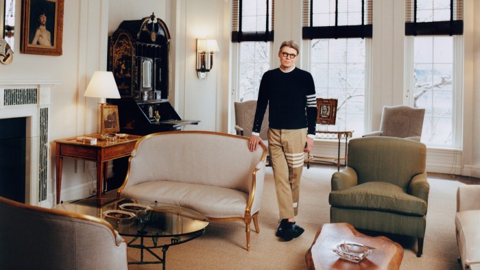 My personal style signifiers are pretty casual and consistent: my tortoiseshell glasses – I’ve worn various brands over the past 20 years – and a navy cashmere four-bar cardigan, chino trousers, white cotton Oxford shirts, a rep tie and classic wingtip brogues, all by my partner Thom Browne.