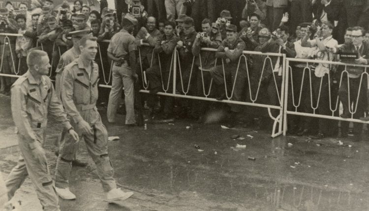 The men splashed down off Okinawa, Japan, about 10 hours after their launch on March 16, 1966, and were brought to Naha Air Base.