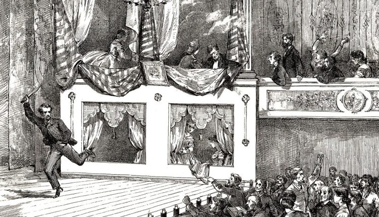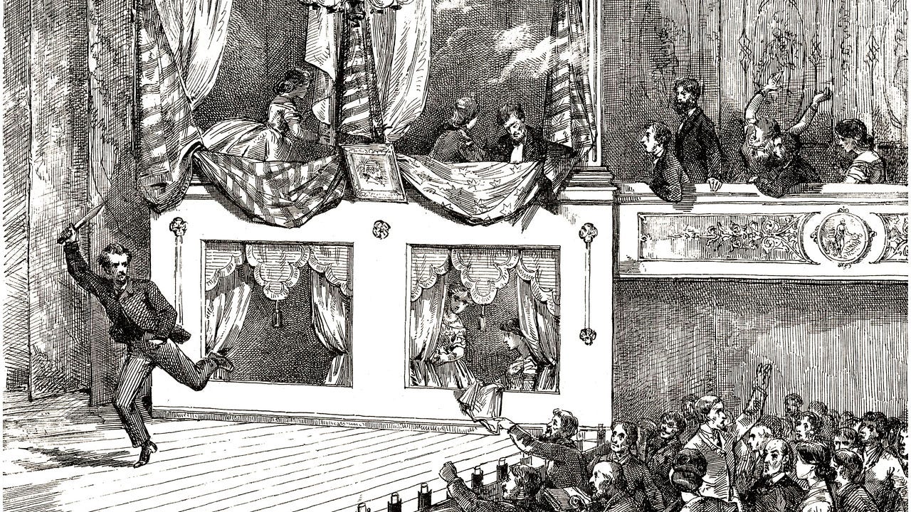 After shooting Lincoln in Ford’s Theatre, Booth jumped down from the president’s box and tumbled onto the stage, says History.com.