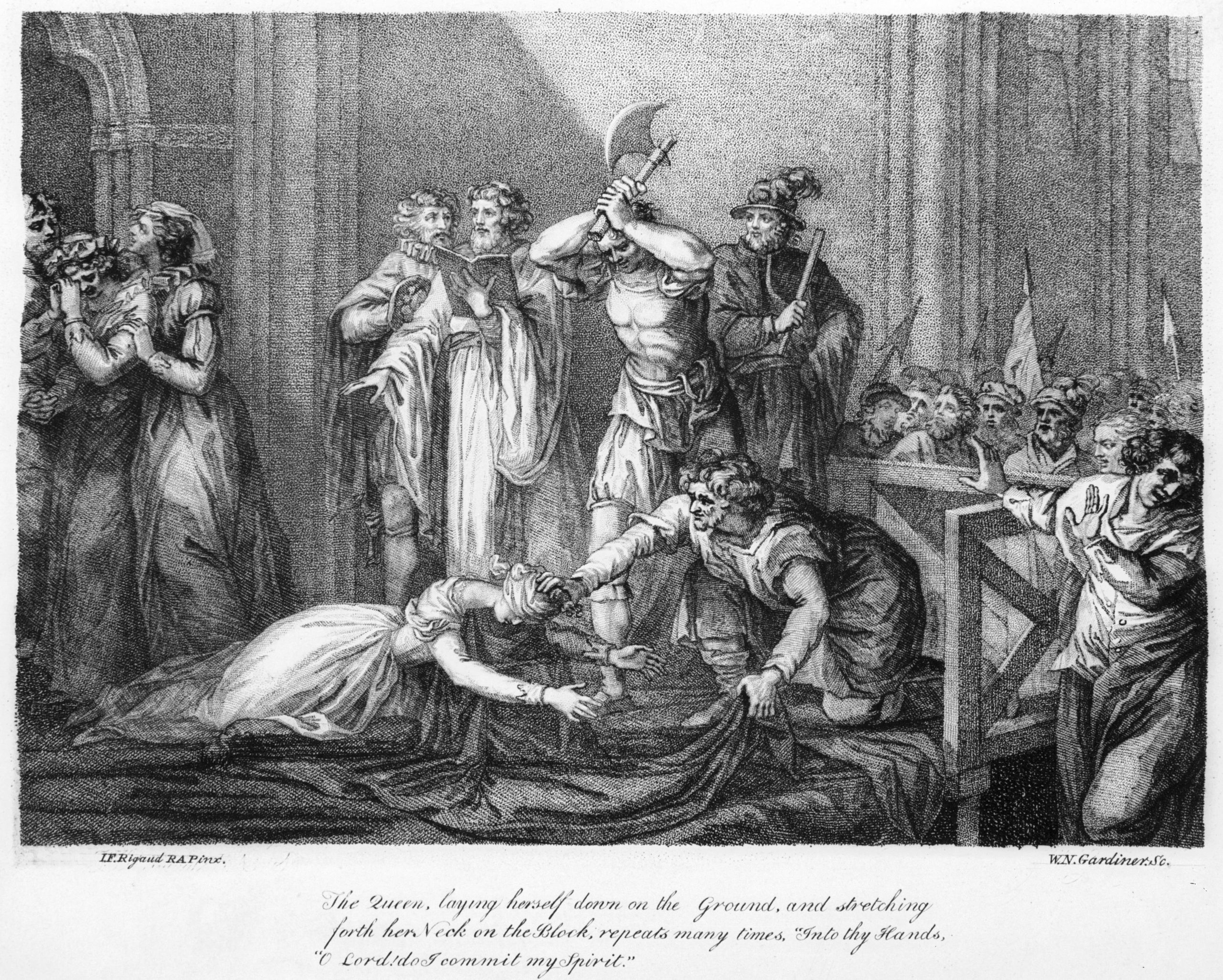 “Her servants Jane Kennedy and Elizabeth Curle helped her to remove her outer garments and she was then blindfolded and knelt down, uttering her last words.”