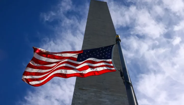 The Washington Monument is surrounded by 50 American flags, one for each state.