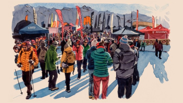Back in Val Thorens, we stopped for lunch then called in at the makeshift village of brightly coloured tents, banners flying above them like a medieval joust, where 50 brands were offering their latest skis and snowboards for testing, for free. By the time I returned to hand back my pair of Salomon Addikt Pro 76s, a DJ was playing — the booth housed in a vintage caravan, the dance floor compacted snow — and vin chaud and cakes were being handed out. Two local breweries had set up stalls; in the cinema a free programme of ski movies was just getting under way.
