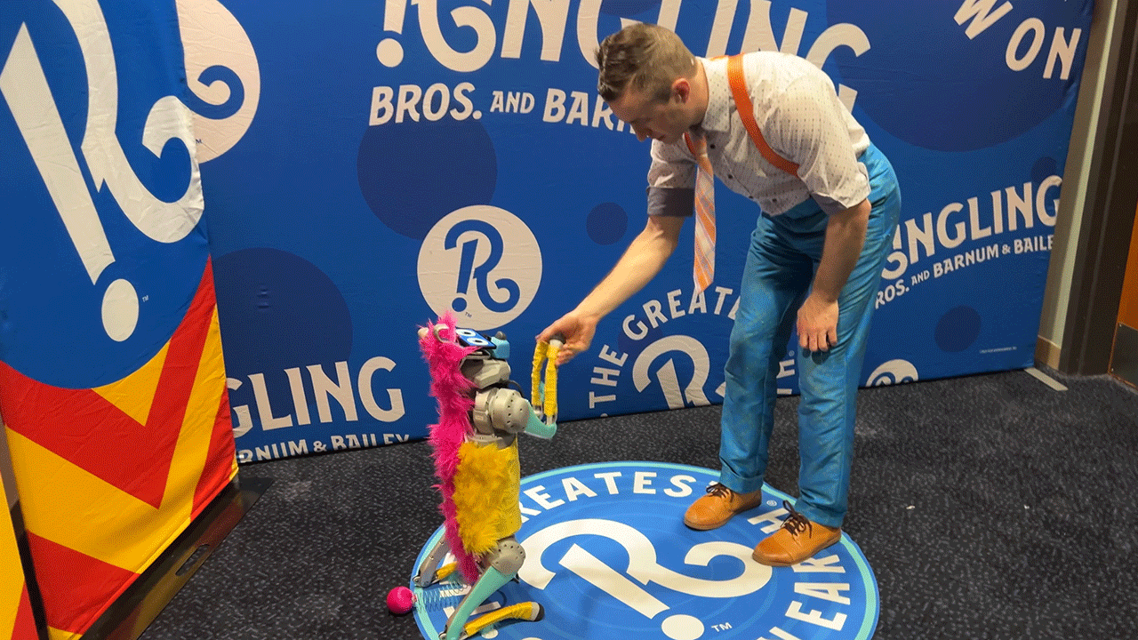 Ringling Bros. circus performer does balancing act with juggling, comedy, rola bola and a robotic dog