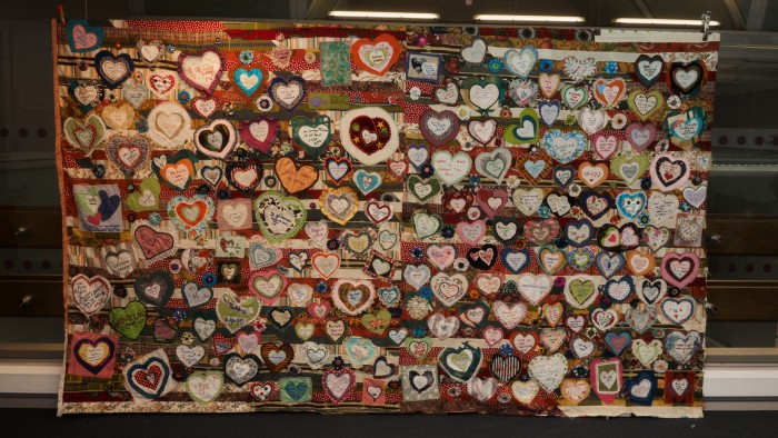 After seeing the offerings of flowers, teddies and hearts – the green heart in particular has become synonymous with the Grenfell community – left as tributes on the neighbouring streets following the disaster, Greenidge was inspired to immortalise the tragedy in a quilt. “There were clothes just dumped in the area,” she says. “When we were sorting them, we were crying. They were rags. We’re making something beautiful.”
