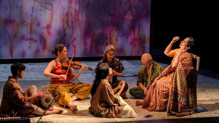 The creators developed the work at a series of exotic residencies in Italy, France and Los Angeles. Doraiswamy inspired her peers with improvised recreations of her grandmother’s “kitchen orchestra”, in which the matriarch encouraged fellow women to sublimate the trauma of abuse through song and improvised percussion. The danger with every intercultural musical collaboration is that complexity is reduced to the lowest-common-denominator pursuit of common ground; these typically reductive compromises dominate Eldar’s score, too. Doraiswamy encourages the audience to sing along; “participatory” and “immersive” are wonderful words for grant applications.