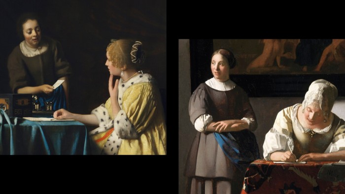 In the most characteristic of the three, “Woman Writing a Letter with Her Maid” (on loan from the National Gallery of Ireland, Dublin), an elegant, bejewelled lady in a lace-trimmed bonnet and a bodice of pale-gold silk bends over her correspondence. She is focused on the task, her concentration heightened by the sunshine that spills through stained glass, spotlighting the hand that draws the quill across the gleaming page.