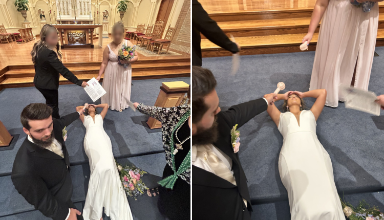 Video from the day shows Franks collapsing three times at the altar. The audience, which was made up of 300 people, was heard gasping while the woman’s husband and bridesmaids rushed to help her.