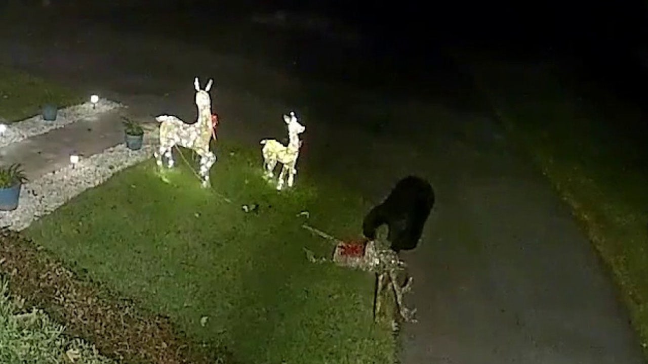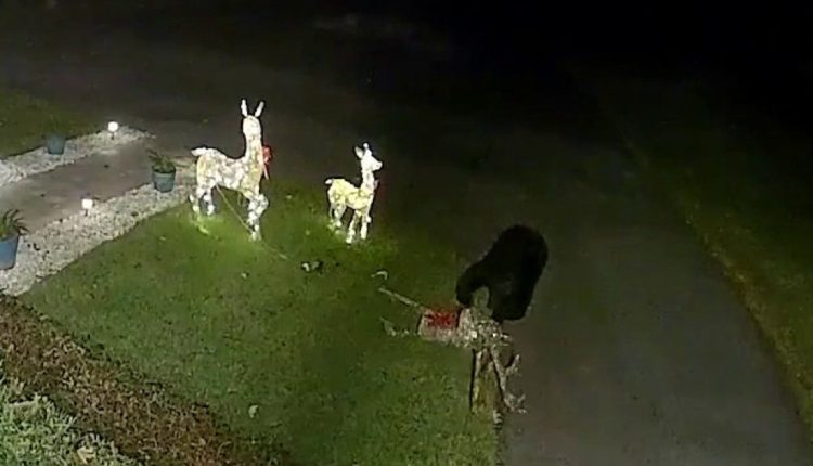 A black bear was caught on a Florida home’s surveillance camera asserting its dominance over the home’s Christmas reindeer decor.