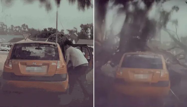 A man in Australia narrowly dodged death after a large lightning strike struck a tree next to his parked car, causing huge branches to crash down onto his car.