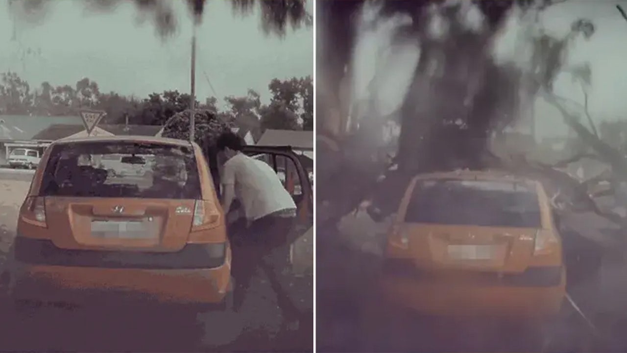 Mere seconds after the man leaves the frame, the video footage captures a loud bang with the tree exploding, sending branches and debris crashing down on top of the car where the man once stood.