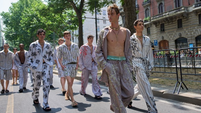 That all keyed to D&G’s own 1990s menswear heritage. Supermodel Linda Evangelista once infamously stated she didn’t get out of bed for less than $10,000 — which is probably what Dolce’s bling PJs will set you back. But as the temperature outside soared into the mid-30s, and the finale of male models took to the streets as if sloping out to buy a pink of milk from the corner shop in their sleepwear, it looked highly attractive as a modern dressing option.