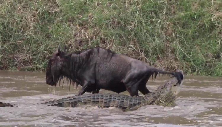 Wildebeest fights for its life as determined crocodile attacks — all caught on video by tour guide
