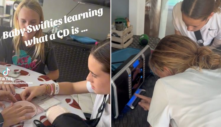 All three “Swifties” can be heard “oohing” and “aahing” as they learn how to open the disc player.