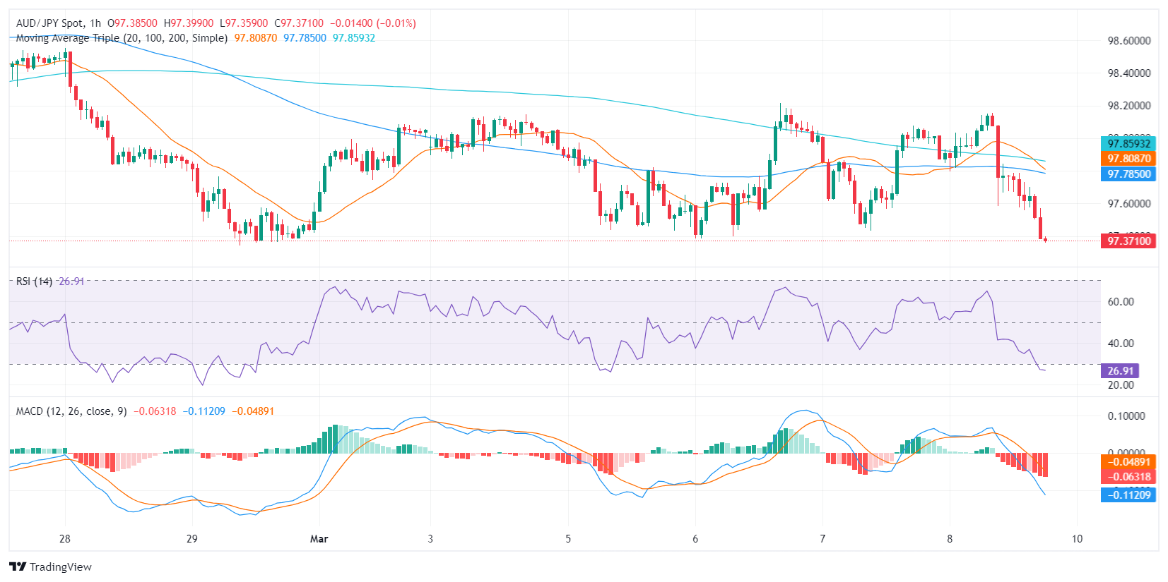 In Friday’s session, the AUD/JPY pair is now trading at 97.49, demonstrating a loss of 0.38%. While the pair is currently dominated by sellers, oversold conditions seen on the hourly chart suggest that the pair may see some upside in the short term to consolidate.
