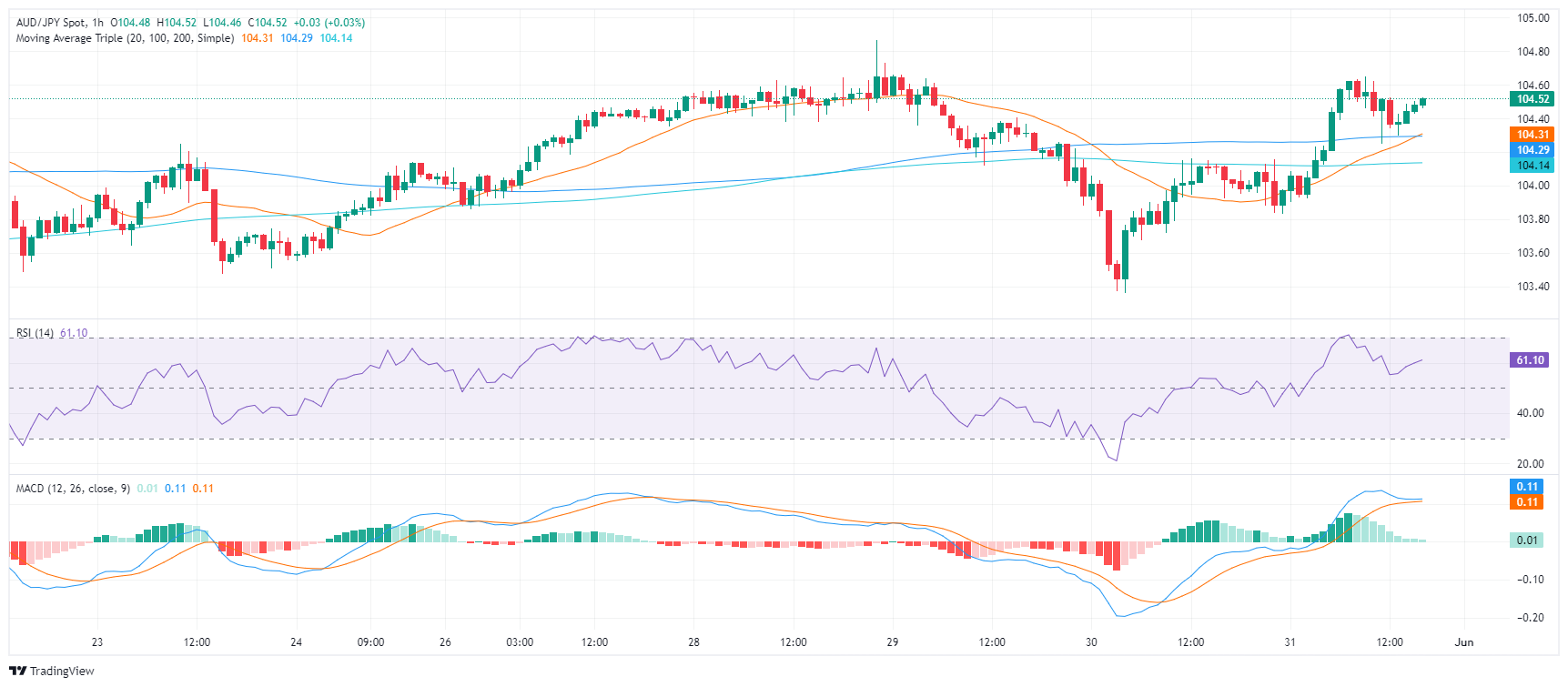 In Friday’s trading session, the AUD/JPY pair soared to the 104.50 region owing to positive momentum, reinforcing expectations of an overall bullish landscape. However, the market’s upward trajectory is showing signs of fatigue, and the pair has entered in a consolidation phase.
